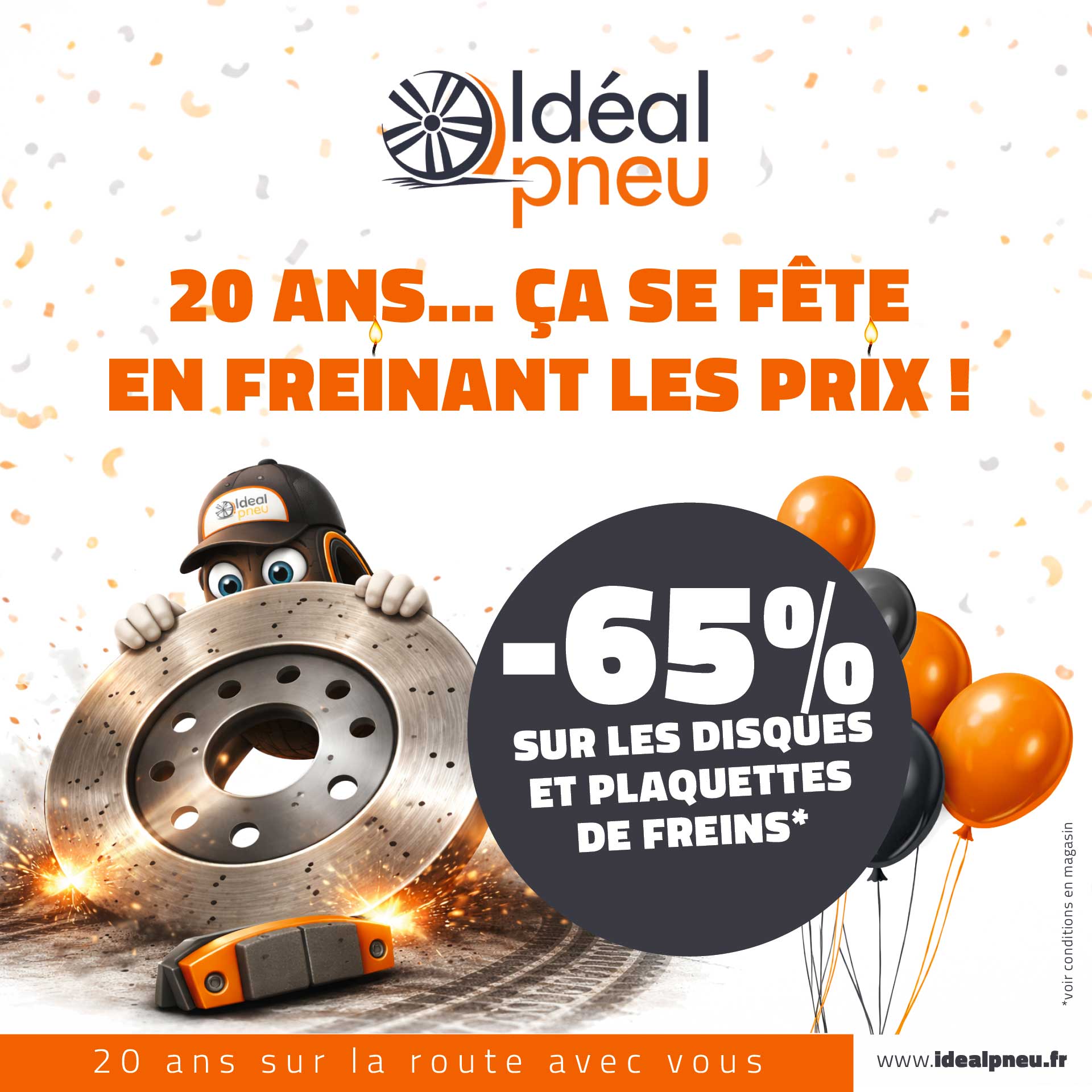 *OFFRE VALABLE du 16/03/2026 au 30/04/2026 pour tout achat d’un jeu de disques ou plaquettes monté dans un de nos centres IDEAL PNEU, dans la limite des stocks disponibles.